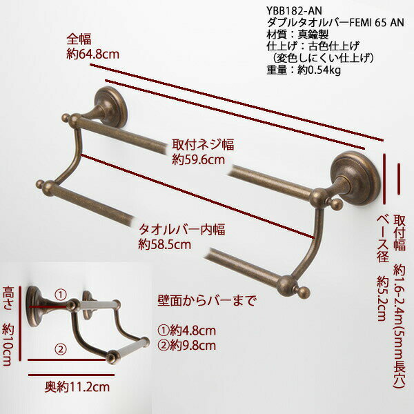 材質 仕上げ 真鍮製(主要部分) アンテーク仕上げ サイズ 重量 幅約64.8cmx奥行11.2cmx高さ約10cm 0.54kg (商品によりばらつきがあります) 原産国 台湾製 耐荷重 約5kg(タオルかけ以外の用途ではお使いにならないでください。