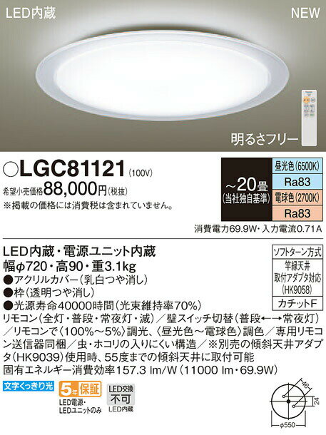 照明 おしゃれ ライトパナソニック Panasonic シーリングライトLGC81121 調光・調色昼光色〜電球色アクリルカバー乳白つや消し 枠透明つや消し 〜20畳