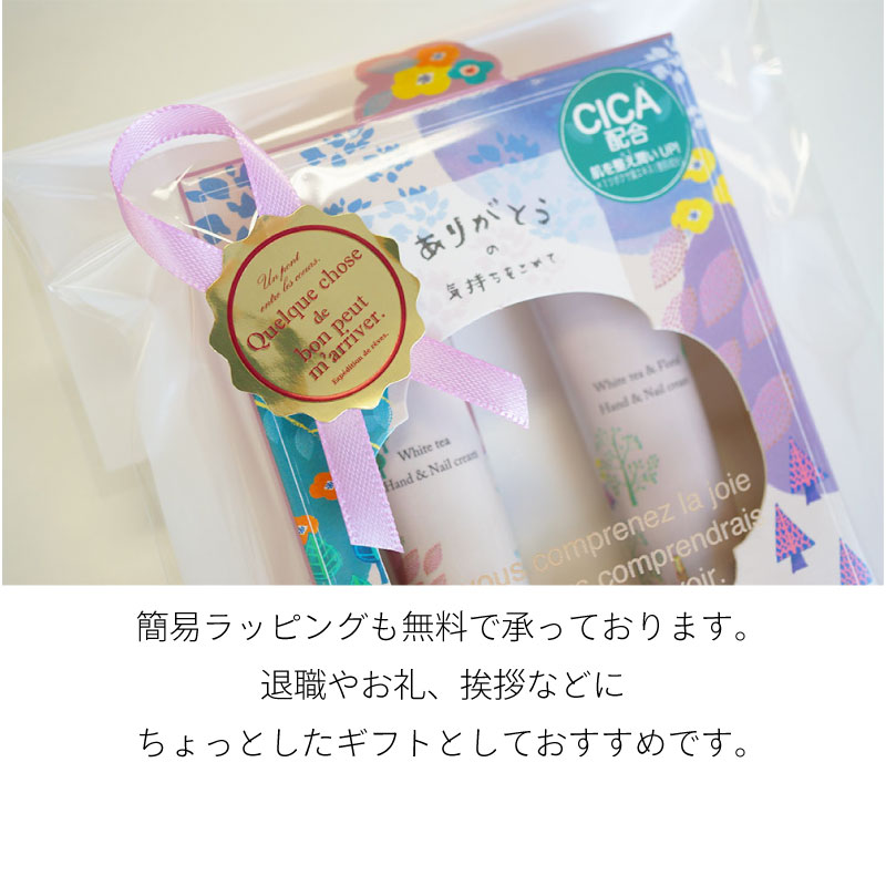◎タイプ 「フォレストチャームハンドクリーム」 ・内容量:10g×2本入り ・香り:ホワイトティー/ホワイトティー&フローラルの香り ・パッケージサイズ:約W8.5×D2×H12cm ・特徴: 肌を整え潤いUP!(ツボクサ葉エキス)CICA配合 「ありがとうの気持ちをこめて」とメッセージが箱に印字されています。