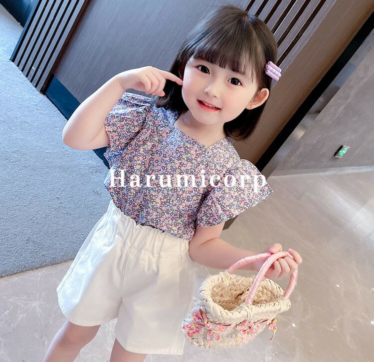 韓国子供服 セットアップ キッズ 女の子 子供服 夏服 ブラウス 花柄 ハーフパンツ 半ズボン おしゃれ 可愛い こども服 ベビー服 パンツセット トップス ボトムス 学生 通学 薄手 涼しい シンプル カジュアル ゆったり 130 120 110 100 90